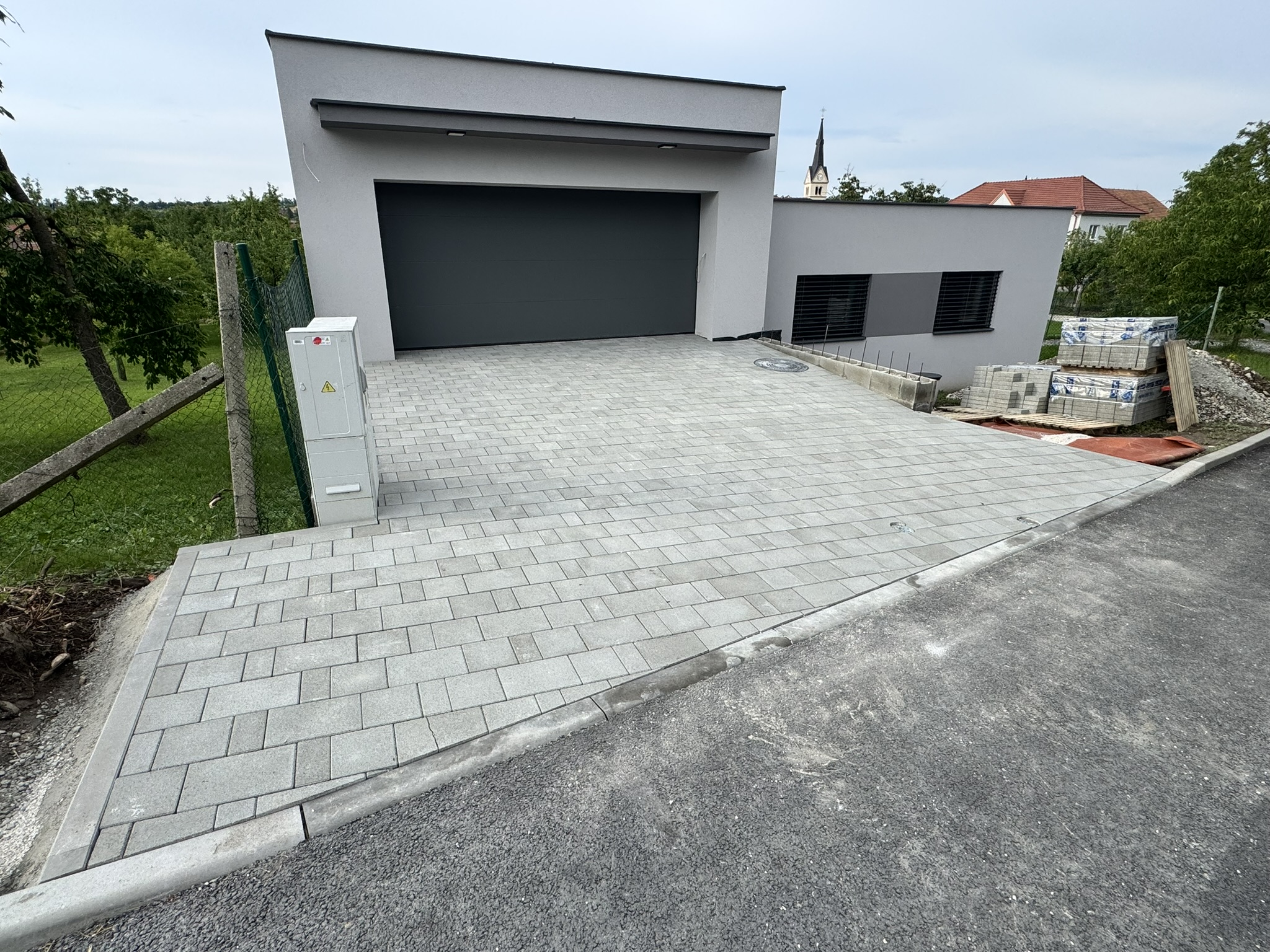 Kompletní realizace příjezdových cest a chodníků včetně podkladních vrstev.